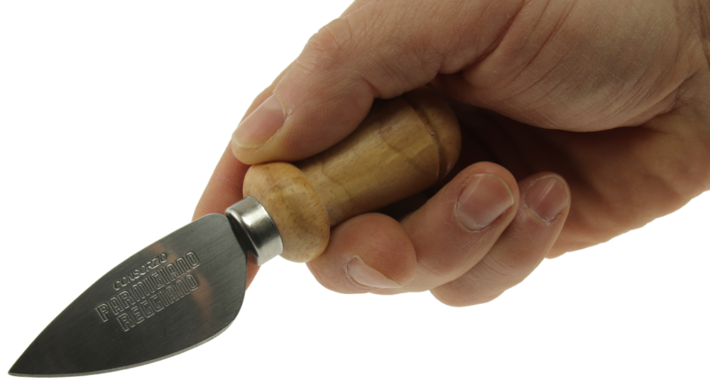 Original Parmesanmesser von Parmigiano Reggiano. Kleine Ausführung mit Holzgriff für den Hausgebrauch, auf Partys oder auf Messen. Länge der Klinge 6 cm, Länge Holzgriff 6 cm. Gesamtlänge 12 cm.